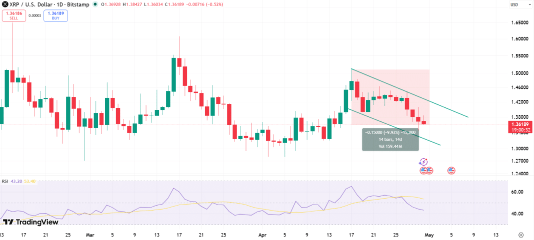 - The $XRP price has corrected nearly 10% from its April 17 peak of $1.51 as buying momentum weakens.