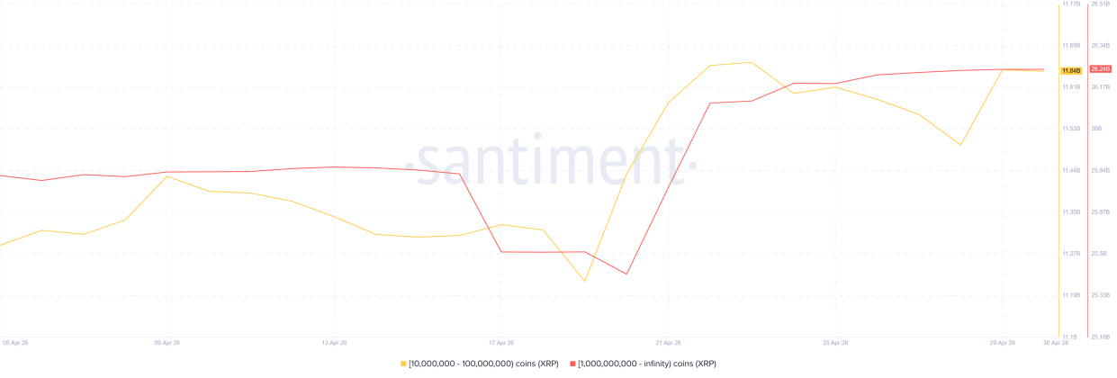 After soaring to a high above $1.51 on April 17 on the back of a broader market recovery push, $XRP faced resistance at this level and has since continued to correct. Interestingly, whales holding at least 10 million $XRP have leveraged this opportunity to amass 1.15 billion $XRP.