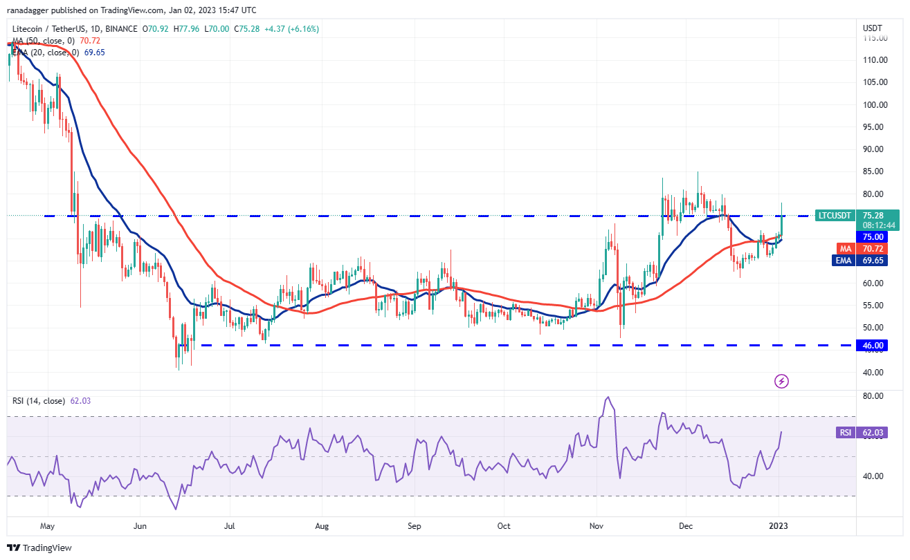 Litecoin (LTC) soared above the moving averages and the overhead resistance at $75 on Jan. 3. This indicates that buyers are attempting to take control.