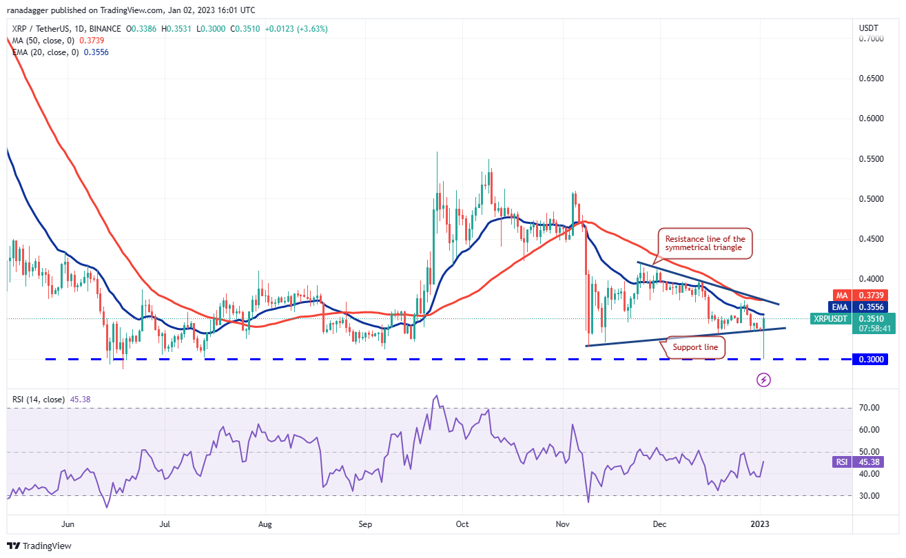 XRP (XRP) tumbled below the support line of the symmetrical triangle and fell to the strong support at $0.30. The long tail on the candlestick shows that the bulls aggressively purchased the dip to $0.30.