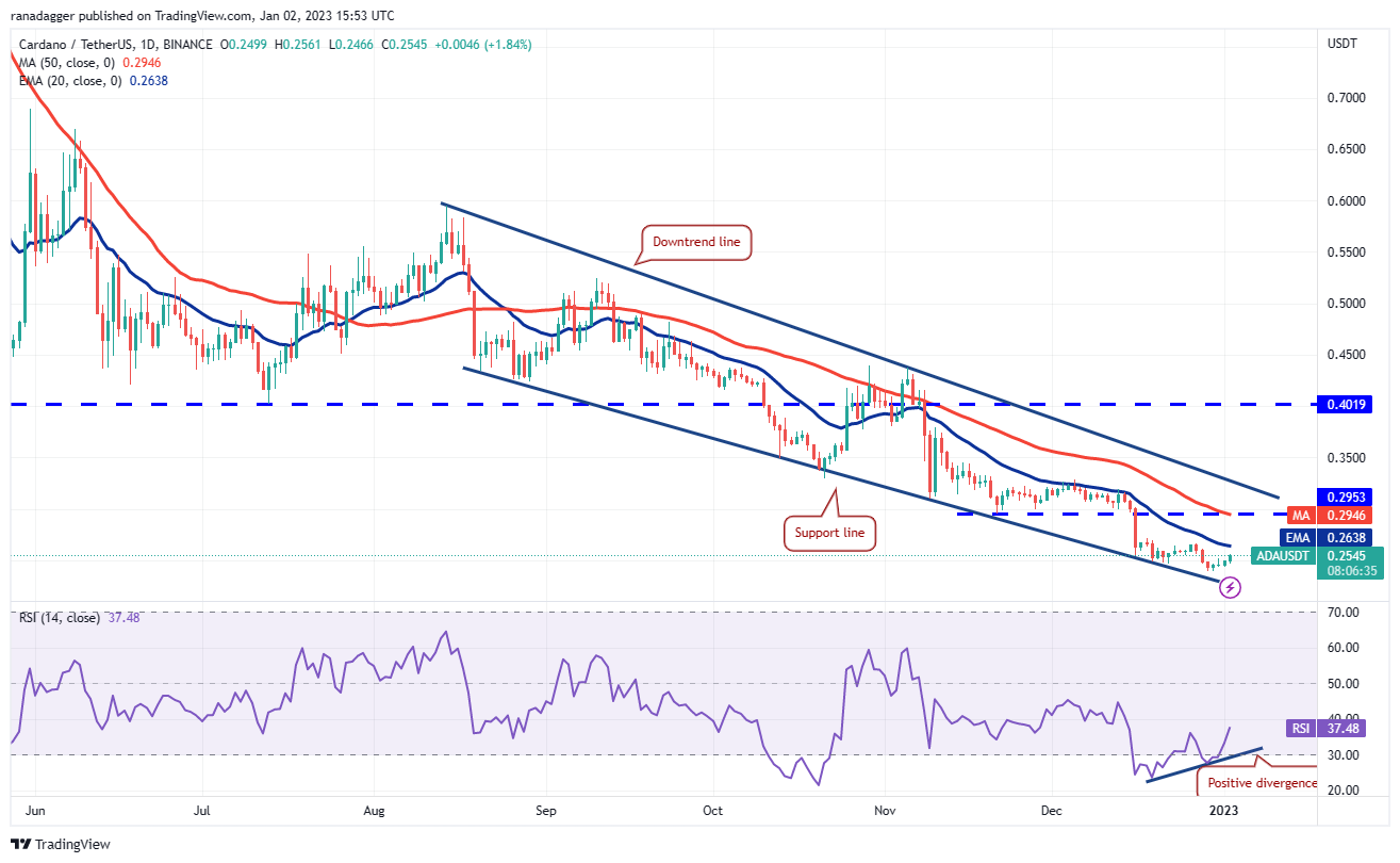 Cardano (ADA) has started a recovery and the price is nearing the 20-day EMA ($0.26). The positive divergence on the RSI suggests that the selling pressure could be reducing.
