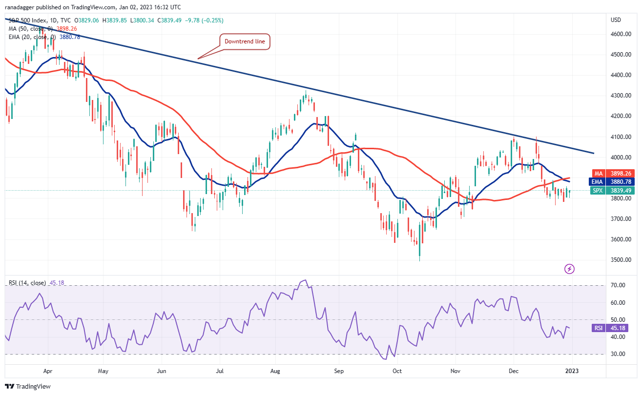 The 20-day exponential moving average (3,880) is sloping down and the relative strength index is near 45, suggesting that bears have a slight edge. If bulls want to gain the upper hand, they will have to push the price above the moving averages.