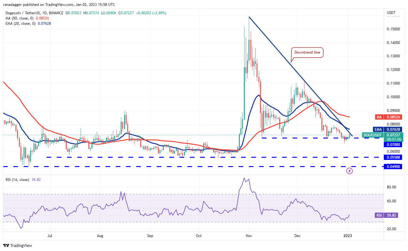 The buying picked up further on Jan. 2 and the bulls are trying to strengthen their position by catapulting the price above the downtrend line. If they can pull it off, the DOGE/USDT pair could challenge the resistance near $0.08. A break above this level could trigger stop losses of aggressive bears, resulting in a short squeeze. The pair could then climb toward $0.11.