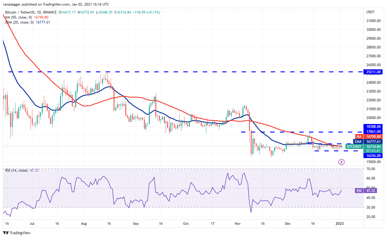 The 20-day EMA ($16,777) is flattening out and the relative strength index (RSI) is just below the midpoint, suggesting a balance between supply and demand. The next trending move is likely to start after the price escapes the range.