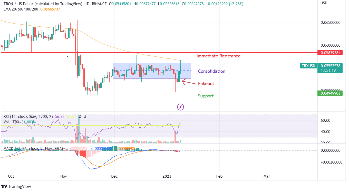 2023 has already begun on a positive note, but TRX managed to find a bearish trend even on a new beginning. However, buyers soon returned the token and took it from the lower band of its consolidation zone to the upper band in two days. With the token holding the 15th spot on the list, the good days for TRX are far from being over.
