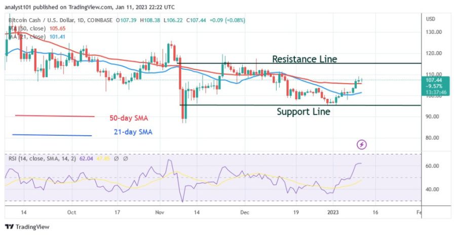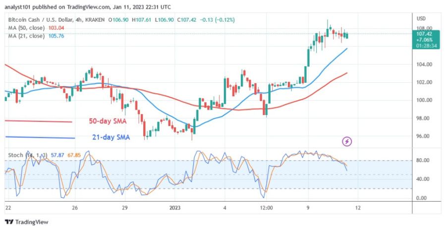The cryptocurrency price rises to a high of $109 before falling. The upside is approaching the overbought area of the market. If the current support remains above the moving average lines, $BCH will rise and return to its previous high of $115. $BCH will fall down if the price drops below the 50-day line SMA. The altcoin will fall and return to its previous low of $95. The price of the cryptocurrency fluctuates in a narrow range between $95 and $115.