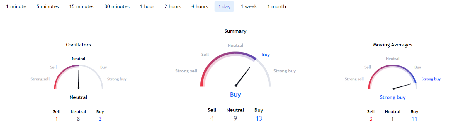 At the same time, the analysis of 1-day sentiment gauges over at finance tracking platform TradingView indicates a bullish sentiment as well, pointing at ‘buy’ at 13, the result of oscillators in the ‘neutral’ zone at 8 (‘buy’ at 2 and ‘sell’ at 1), and MAs suggesting a ‘strong buy’ at 11.