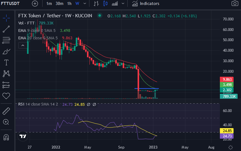The price of FTT is now trading at the weekly resistance level at $3.822, which is also the current level of the 9-week EMA line. The weekly RSI for FTT is on the verge of flagging bullish, with the weekly RSI line looking to cross the weekly RSI SMA line.