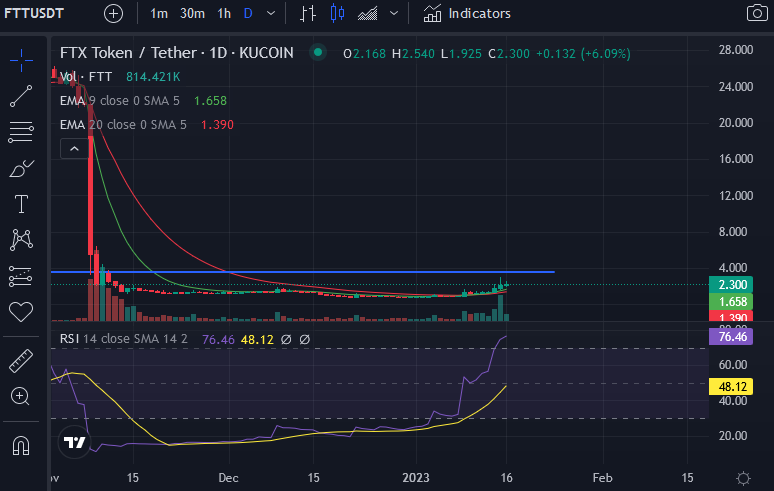 The price of FTT has risen above both the 9-day and 20-day EMA lines after the daily RSI line broke above the daily RSI SMA line.
