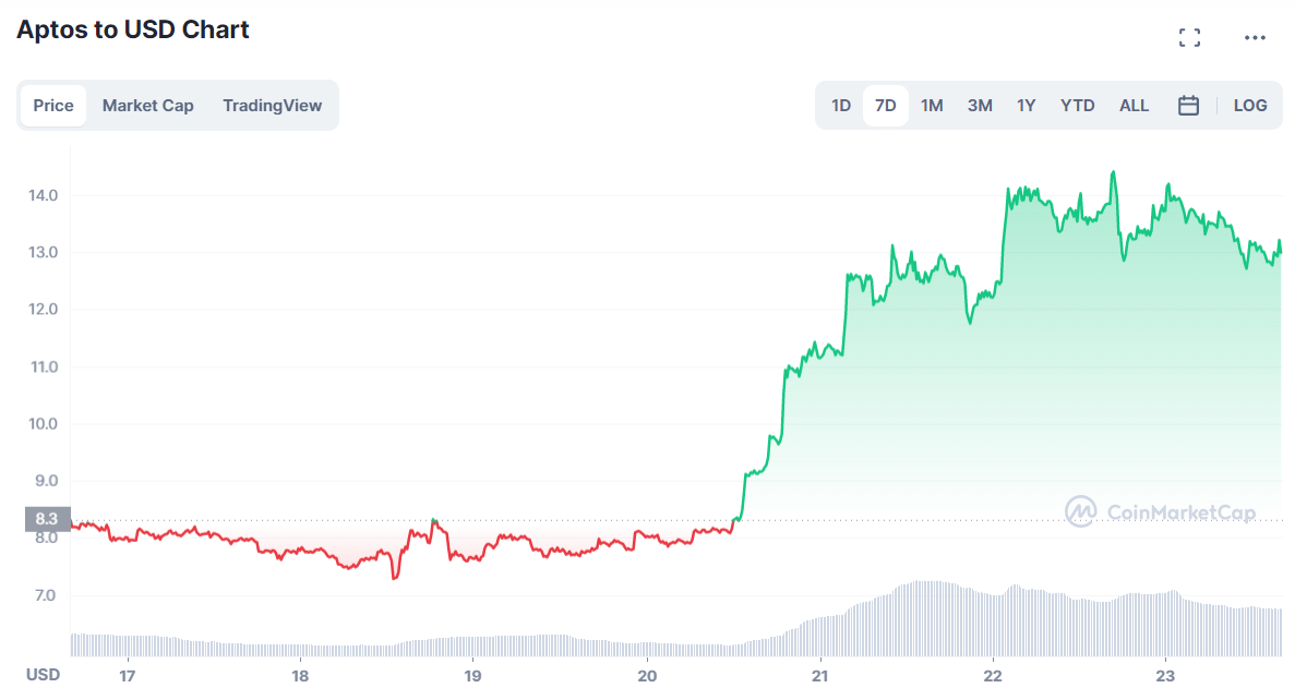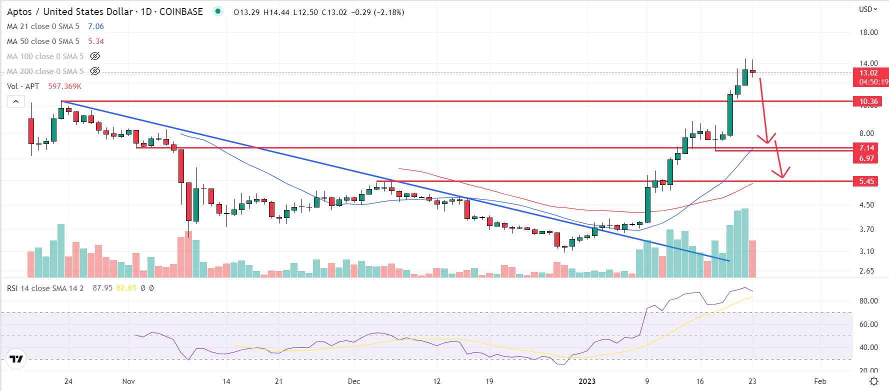 APT, the token that powers new up-and-coming layer-1 blockchain Aptos, is consolidating just to the north of the $13 level on Monday. Profit-taking in wake of a stunning 281% rally since the start of the month, with over 70% of these gains coming in the last seven days, preventing the cryptocurrency from holding at record-high levels just to the north of the $14 mark.