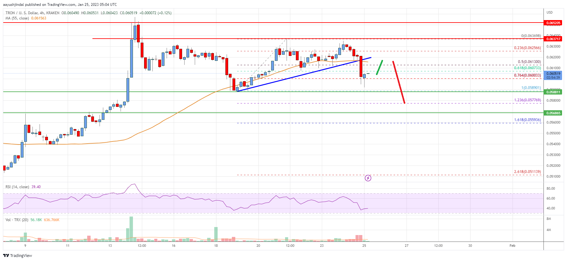 The price is now trading below $0.0620 and the 55 simple moving average (4-hours). On the upside, TRX is facing resistance near the $0.0620 level.