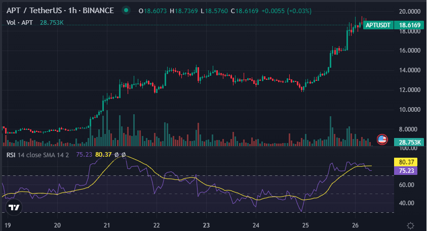 Aptos (APT) surprised investors in the best way possible after a triple-digit increase in price over the last week. According to CoinMarketCap, APT is currently trading hands at $18.71 after a 37.29% price increase over the last day. The crypto was also able to reach a high of $19.36 and a low of $13.46 over the same time period.