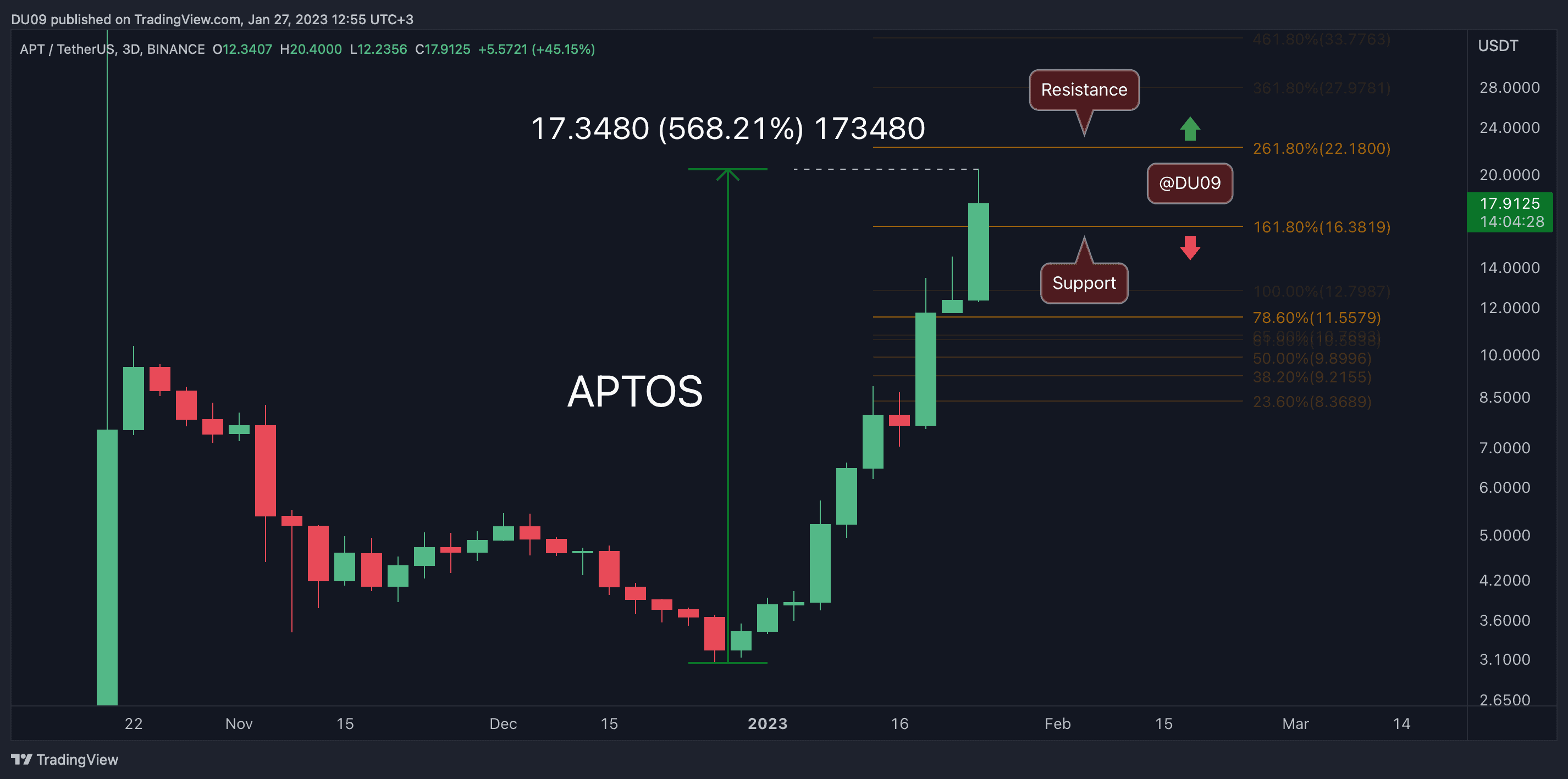Aptos is the clear winner on our list this week after booking a 127% price increase. This extraordinary performance comes on the back of an unbelievable rally that started in early January. Since then, APT’s price has increased by more than 400%.