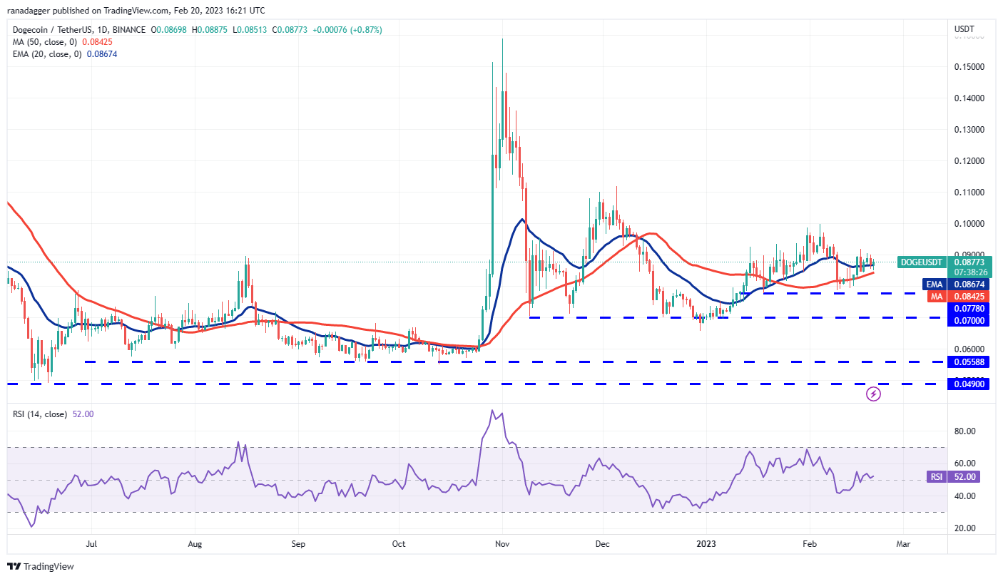 The bulls and the bears are witnessing a tough battle near the moving averages. A minor positive is that buyers have not allowed Dogecoin (DOGE) to sustain below the 50-day SMA ($0.08), indicating demand at lower levels.