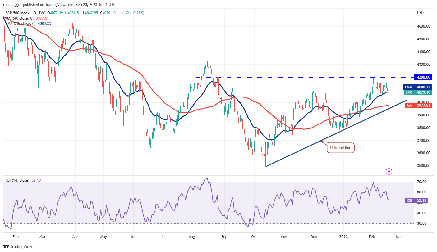 The S&P 500 index (SPX) bounced off the 20-day exponential moving average (4,080) on Feb. 10 but the bulls could not push the price to the overhead resistance at 4,200. This emboldened the bears who pulled the price below the 20-day EMA on Feb. 17. A minor positive for the bulls is that lower levels attracted strong buying as seen from the long tail on the day’s candlestick.