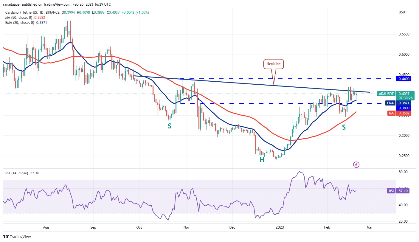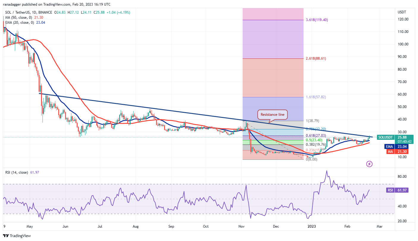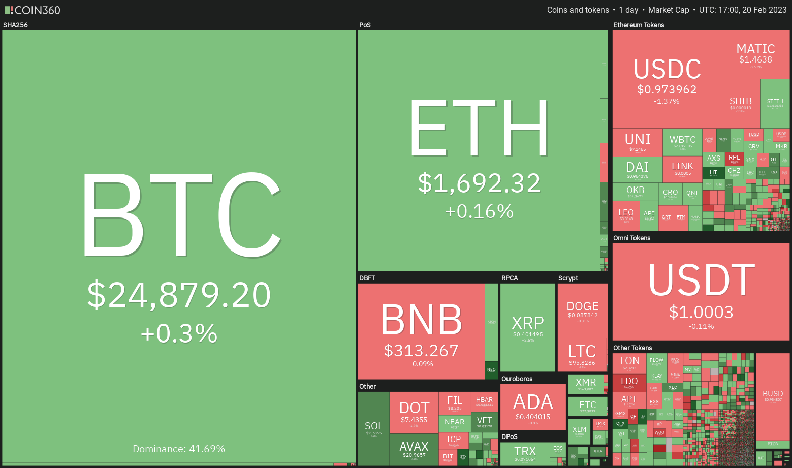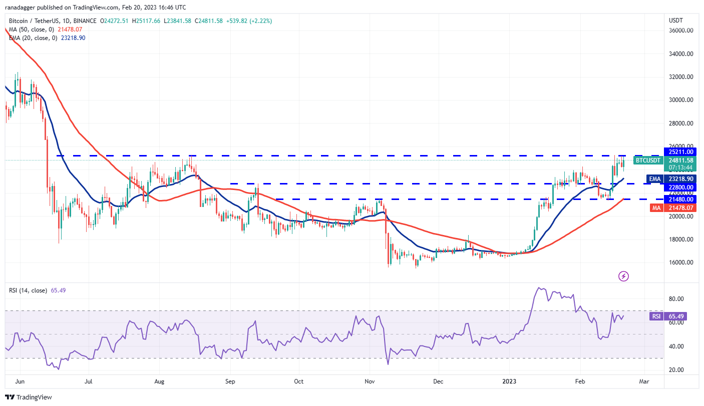 Bitcoin has been trading near the strong overhead resistance at $25,211 for the past four days. Although the bears have defended the level successfully, the bulls have not given up. They again jumped on the opportunity on Feb. 20 and purchased at lower levels.