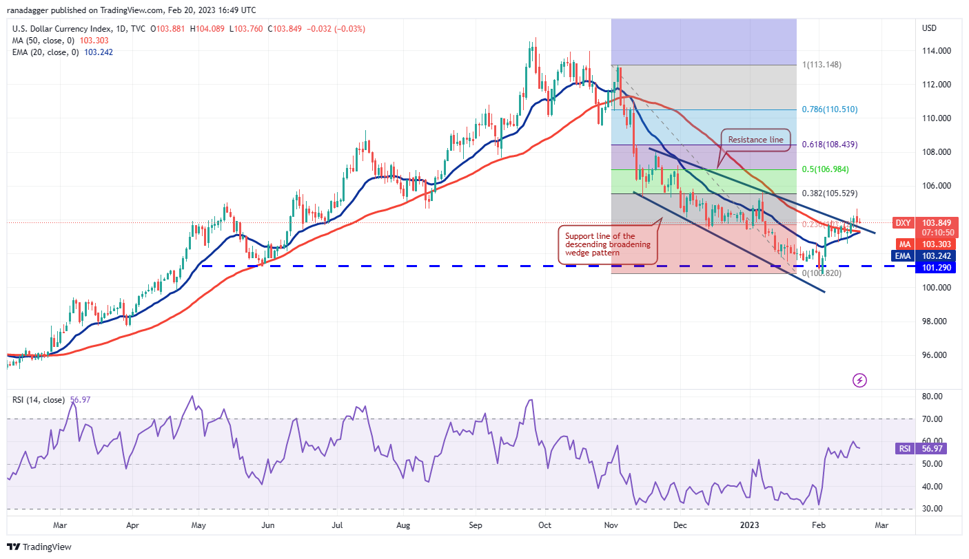 The U.S. dollar index (DXY) broke and closed above the wedge pattern on Feb. 16. The moving averages are about to complete a bullish crossover and the RSI is near 57, indicating that bulls are trying to make a comeback.