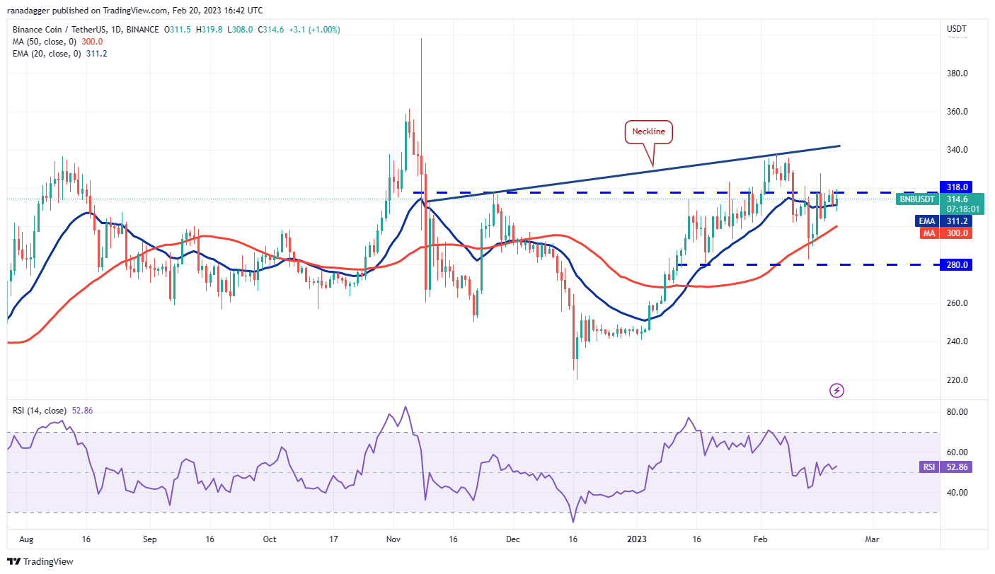 Sellers are trying to defend the $318 resistance but the bulls have not allowed BNB’s (BNB) price to sustain below the moving averages. This suggests that lower levels are attracting buyers.