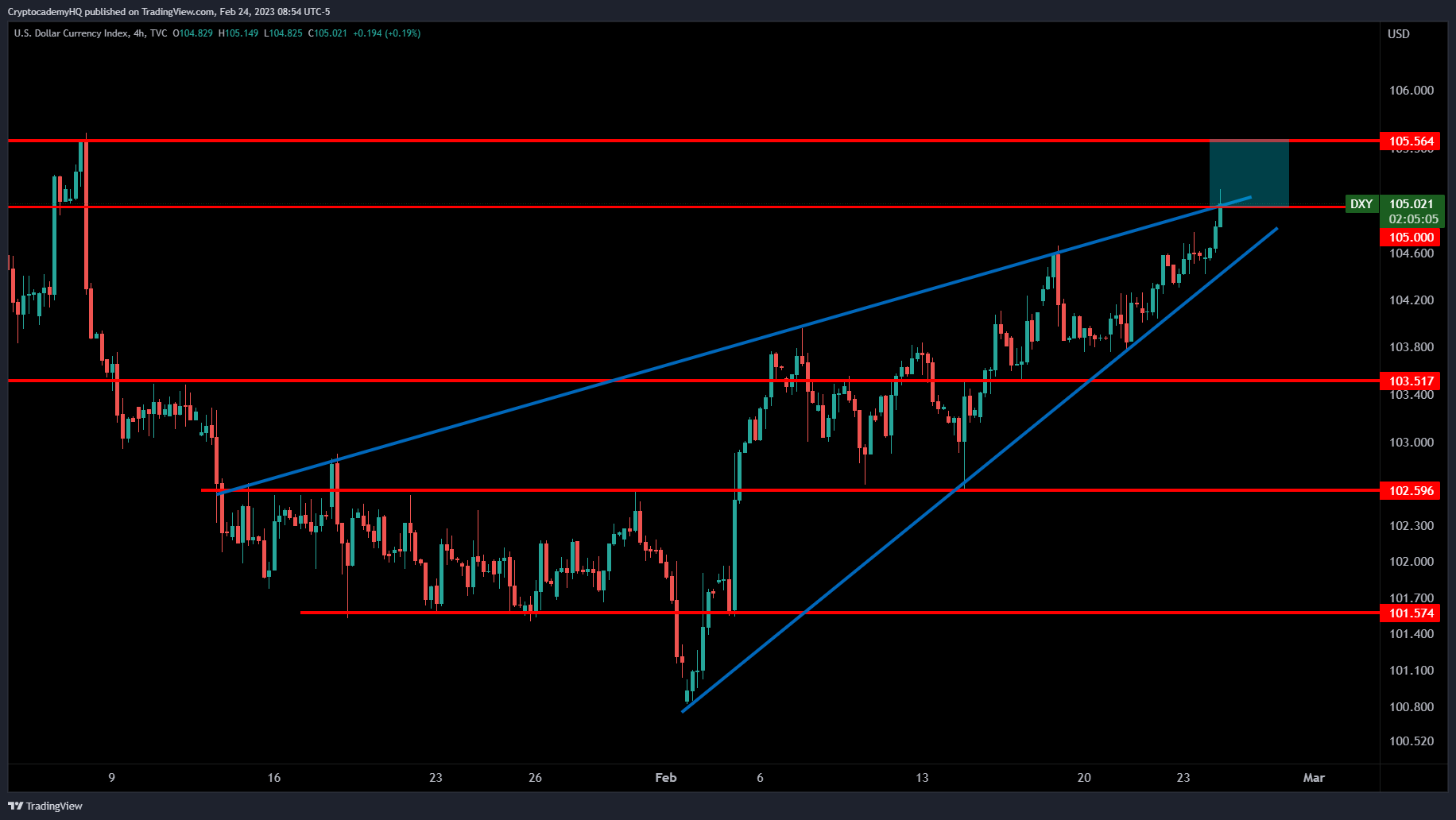 The trader also breaks down the US Dollar Index (DXY), a measure of the strength of the US dollar against a basket of assets, in this case, digital assets. Generally speaking, a stronger DXY means weaker assets and vice versa. According to Bennett, the DXY is currently testing a new, higher level.