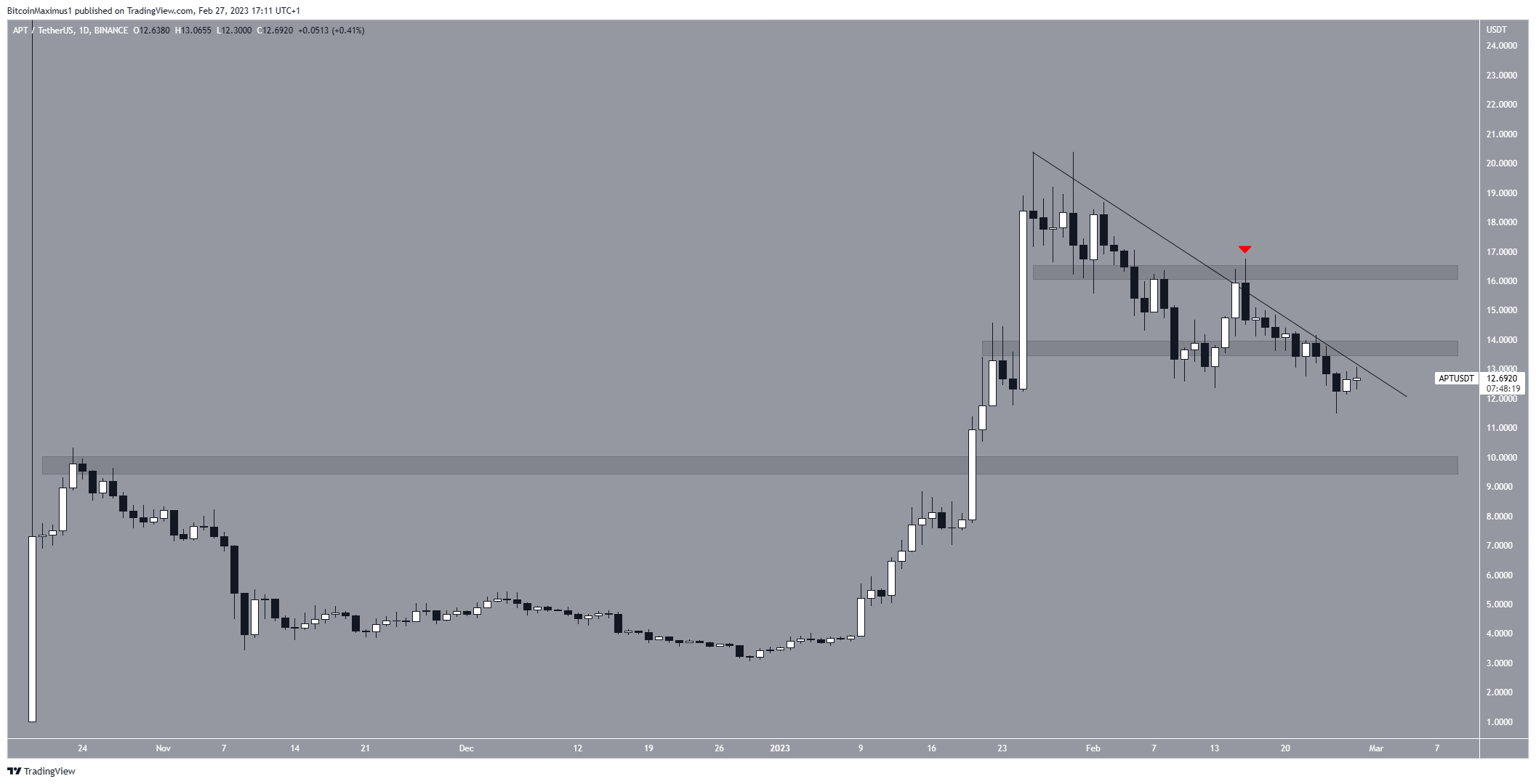 The APT price decreased for the entire February, following a descending resistance line in the process. On Feb. 16, both the line and the $16.50 resistance area caused rejections and catalyzed the ongoing downward movement. The price still trades below this resistance line and broke down from the $13.75 resistance area.