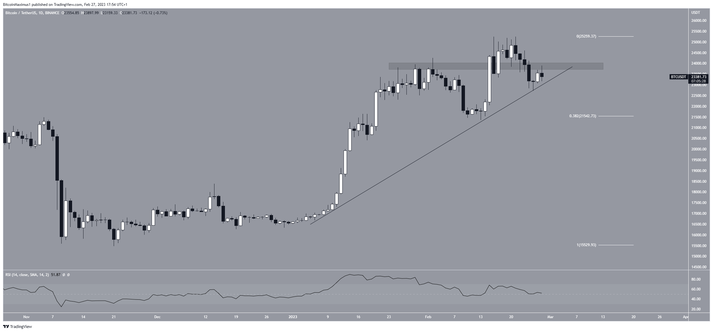 The Bitcoin price currently trades at a point of convergence between important resistance and support. The $23,900 horizontal area provides the main resistance while the ascending support line holds up the price. Whether the BTC price breaks out above the former or down from the latter could determine the future trend. A breakout would likely take the price toward $28,000, while a breakdown could cause a fall to the 0.382 Fib retracement support level at $21,540.