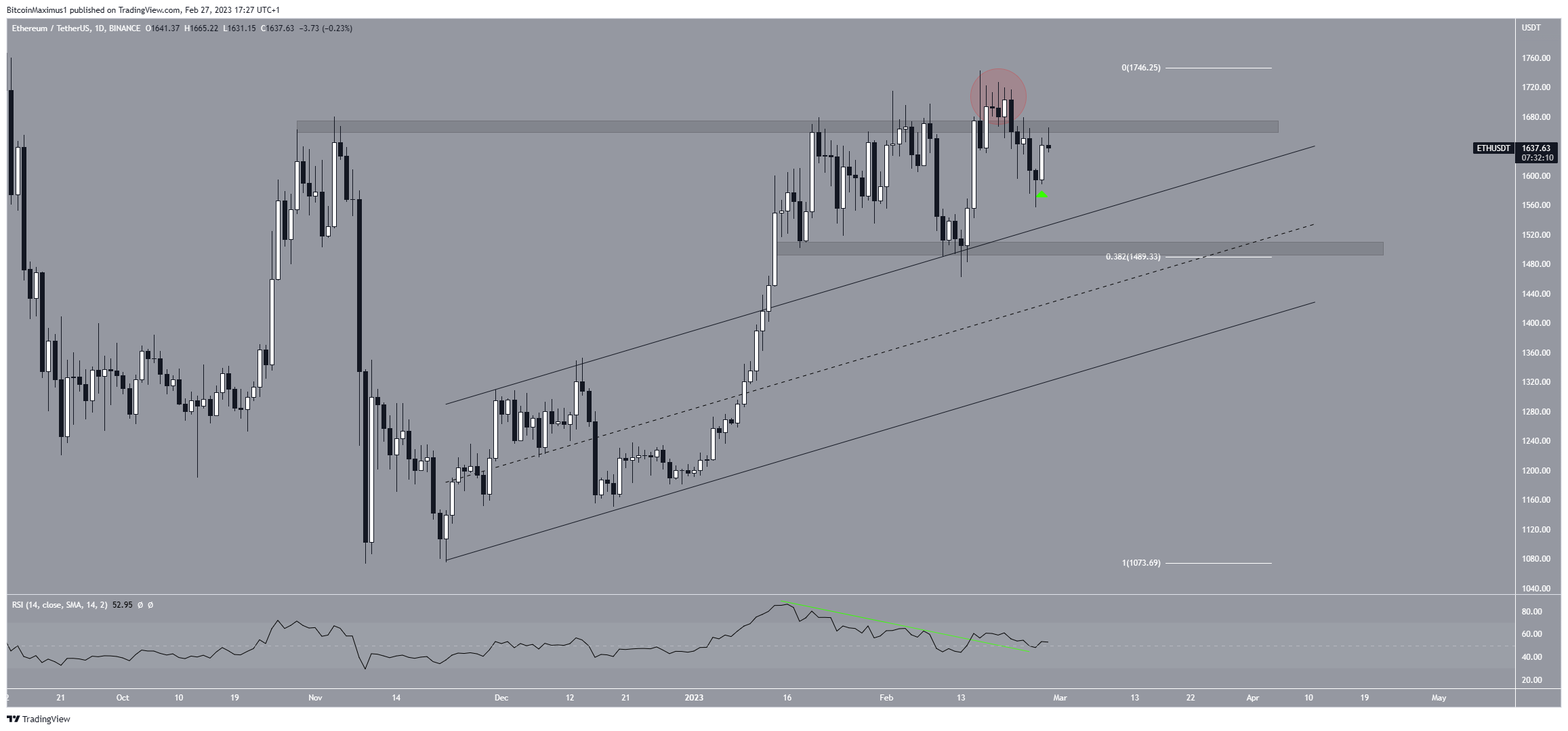 That was exactly what happened with the ETH price, as the deviation led to a low of $1,557 on Feb. 25. However, the ETH price recovered afterward and is now attempting to break out above the $1,690 resistance area. If it is successful, this could lead to an increase toward $2,000. However, a rejection from this area could cause a drop to $1,490. Since the RSI broke out from its bearish divergence trend line (green line), a breakout is slightly more likely.