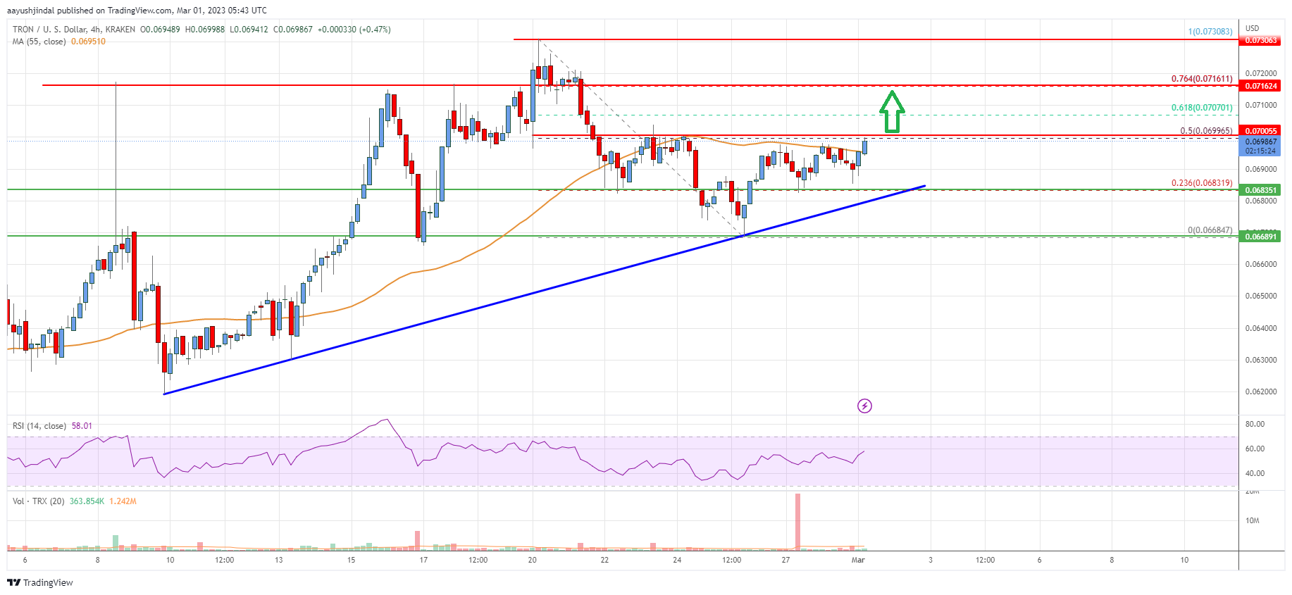 The chart indicates that TRX price is now trading above $0.068 and the 55 simple moving average (4-hours). Overall, the price could continue to move up if it breaks the $0.070 resistance zone.