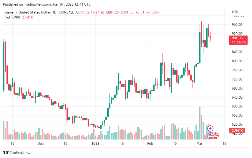 MKR’s price is currently hovering at $901.35 in the daily chart. | Source: MKRUSD price chart from TradingView.com