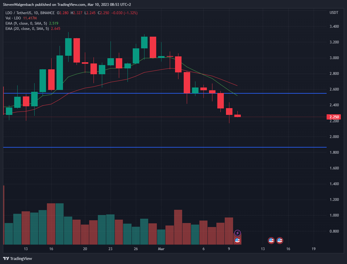 $LDO has entered into a short-term bearish cycle as indicated by the 9-day EMA line crossing below the 20-day EMA line on 6 March 2023.