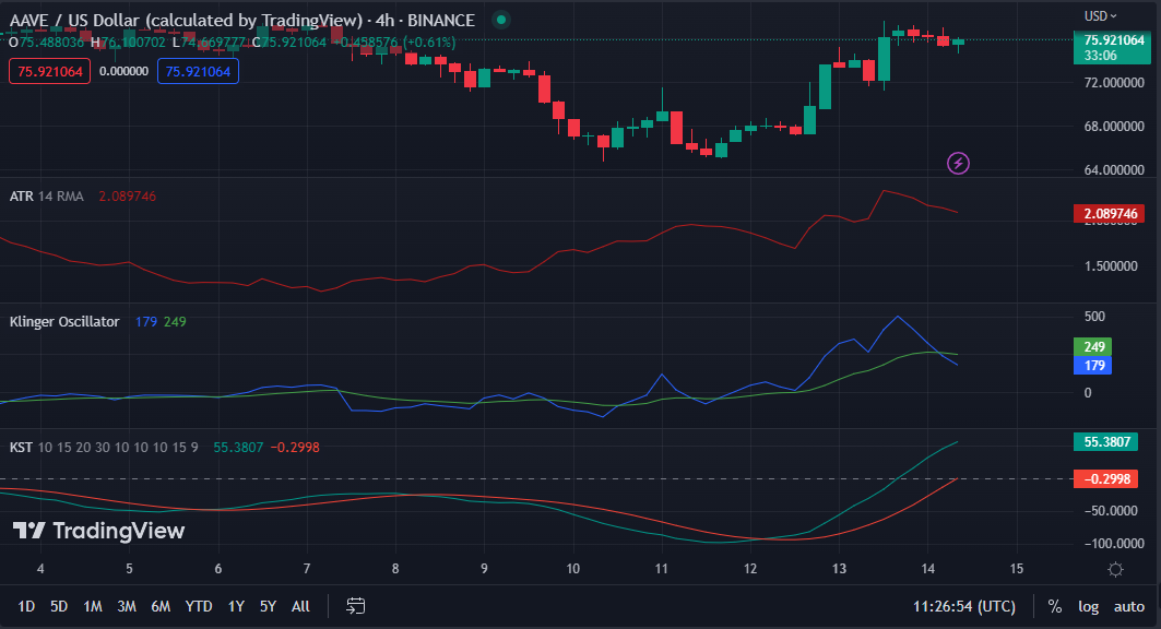 In the AAVE price chart, the ATR value of 2.087816 suggests that the AAVE price has lately been volatile. This movement may imply potential opportunities for traders willing to take additional risks.