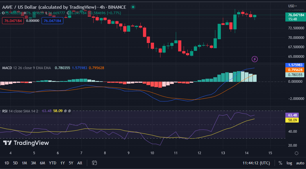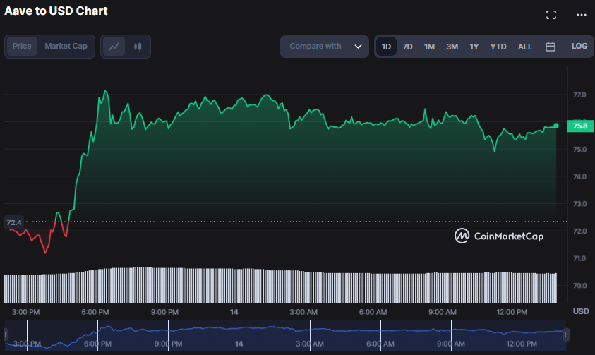 Aave (AAVE) prices have surged to a 7-day high of $77.21 after sustained advances over the previous 24 hours. The bears’ attempt to sink the market was thwarted as the AAVE market found support at the day’s low of $71.17. The AAVE price rose by 4.70% to $75.77 over the last 24 hours, at the time of writing.