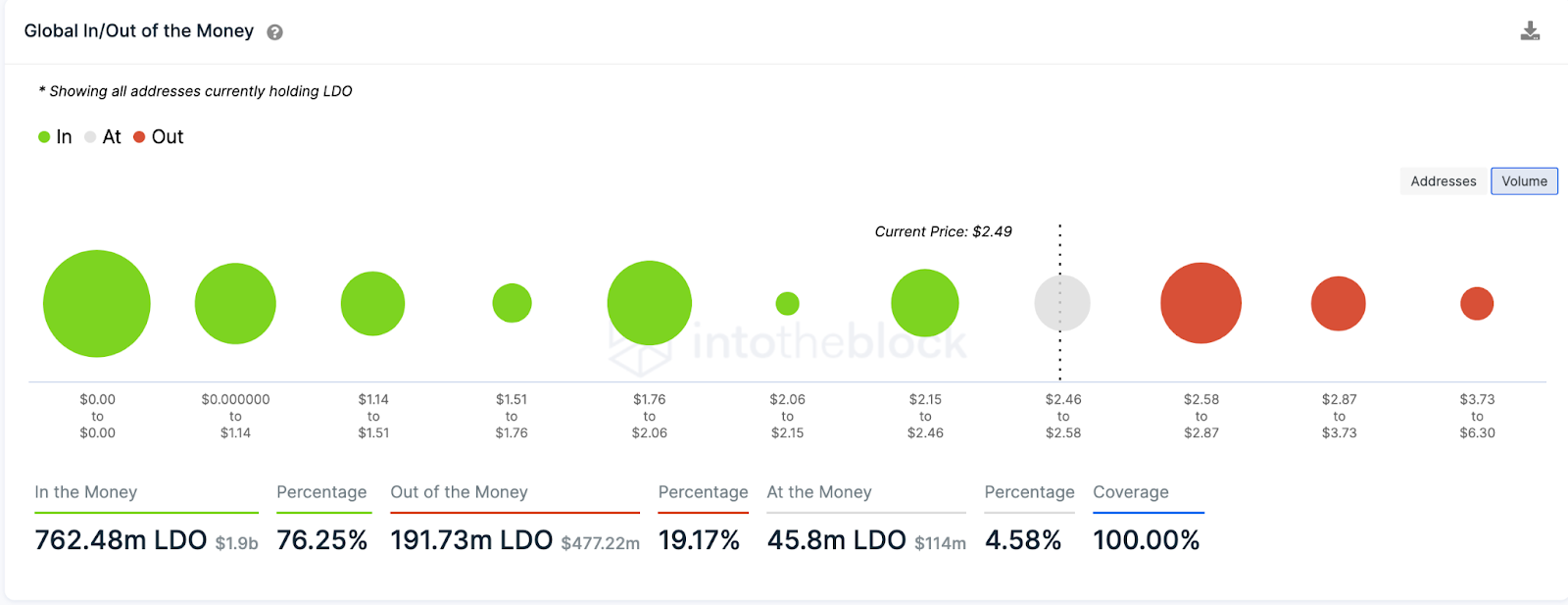 IntoTheBlock’s Global In/Out of Money Around Price (IOMAP) data suggests that the price of the Lido DAO native token could drop below $2 if it loses its current support level at $2.31.
