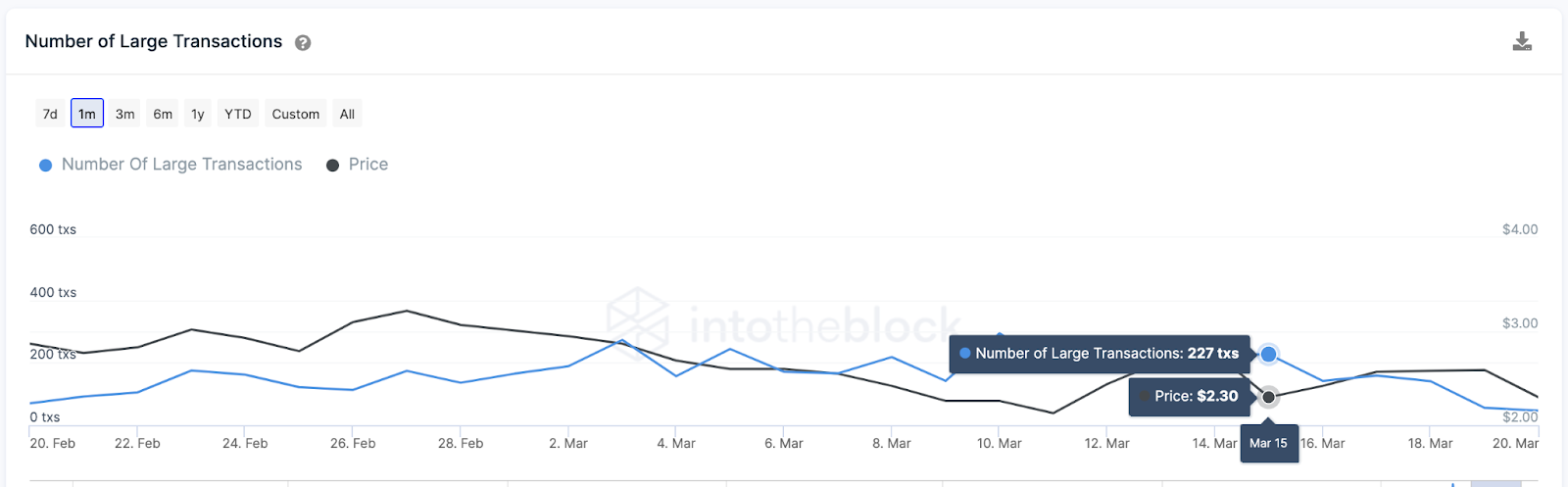 LIDO whales performed 227 large transactions worth more than $100,000 on March 15. But by March 21, the number of large transactions on the network had declined to 47 transactions, representing an 80% drop.