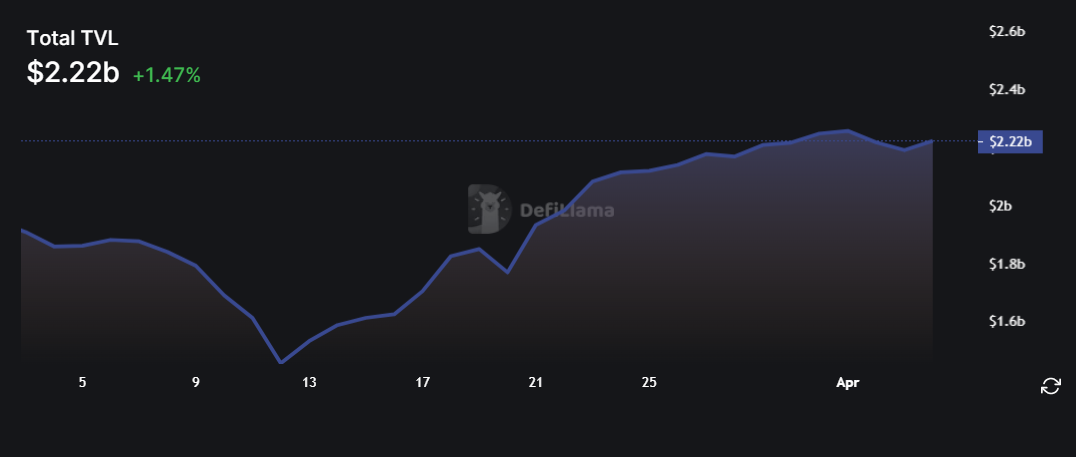While Arbitrum’s native token is caught in the bear zone, its total value locked (TVL) has been growing since March 13, according to data provided by DeFi Llama. The TVL on the side-chain sits at $2.2 billion at the time of writing, up by 1.47% in the past 24 hours.