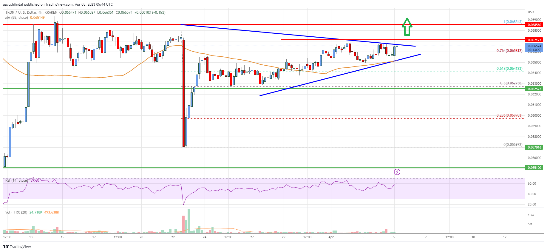 The price is now trading above $0.064 and the 55 simple moving average (4 hours). On the upside, TRX is facing resistance near the $0.0665 level.