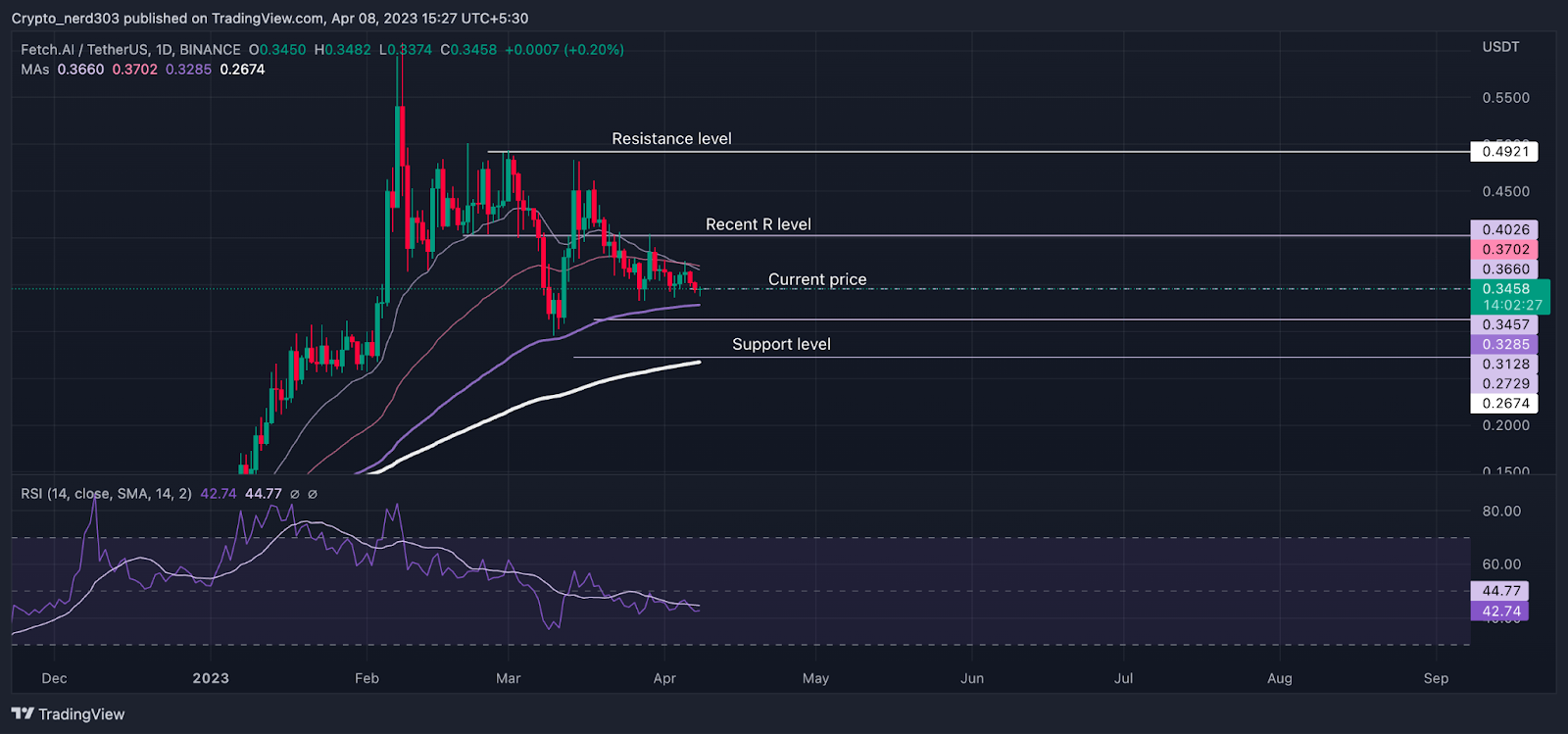 The recent support zone for FET is near the $0.3285 price. 15% below it, is its major support level near the 200 EMA around $0.2673. On the other hand, the current resistance level for the Fetch price is 16% above, around $0.4000. Its major resistance level, which could be a target, is $0.5000, 42% above.