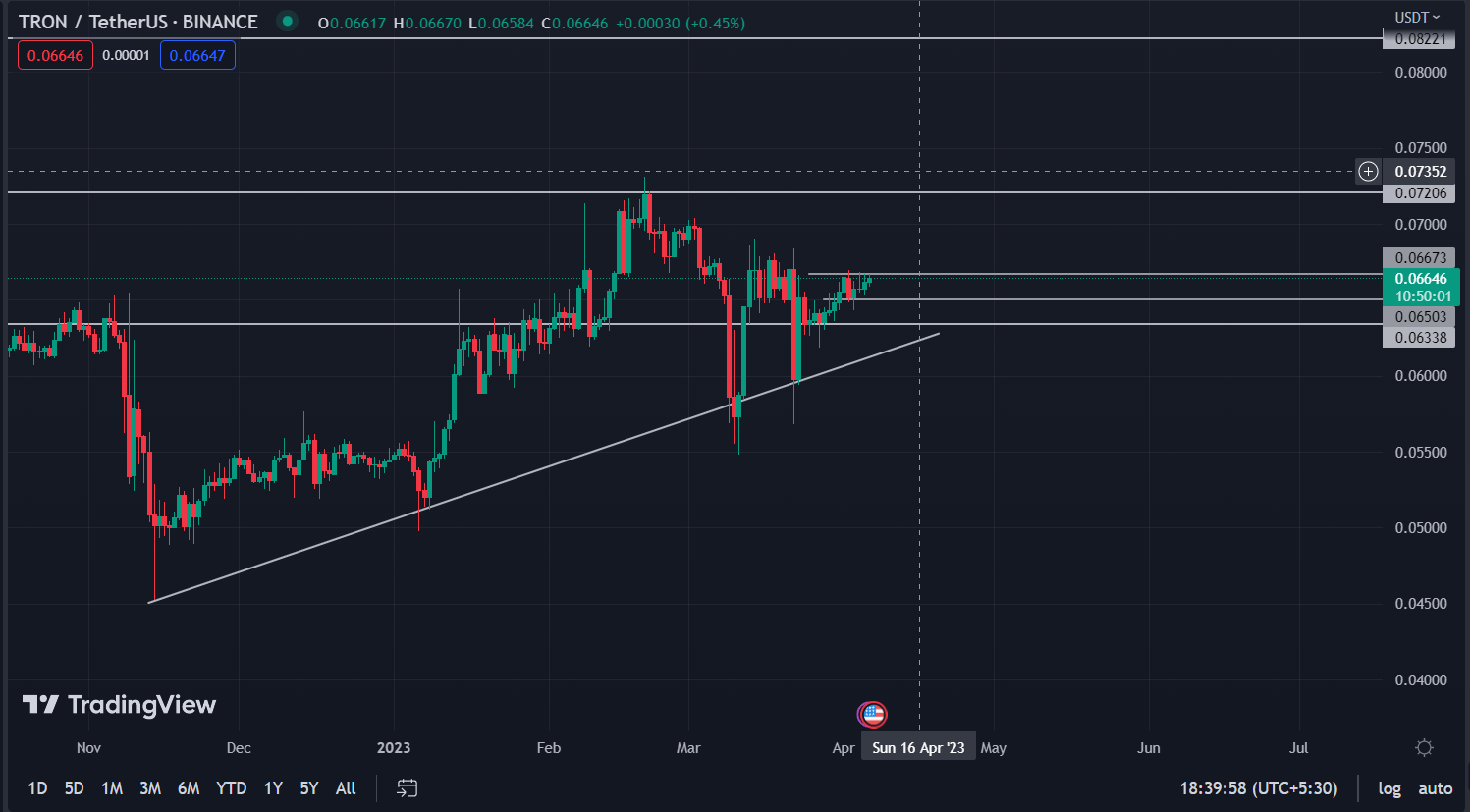 The TRX price was in a bullish trend during the start of 2023 and made a high $0.072 level and fell 23.91% which made the price fall to $0.05745 level. The price on the daily time frame is bullish and is approaching the resistance level at $0.06700. If the price can break above the immediate resistance, there is an easy target for the price to reach $0.07000 level.