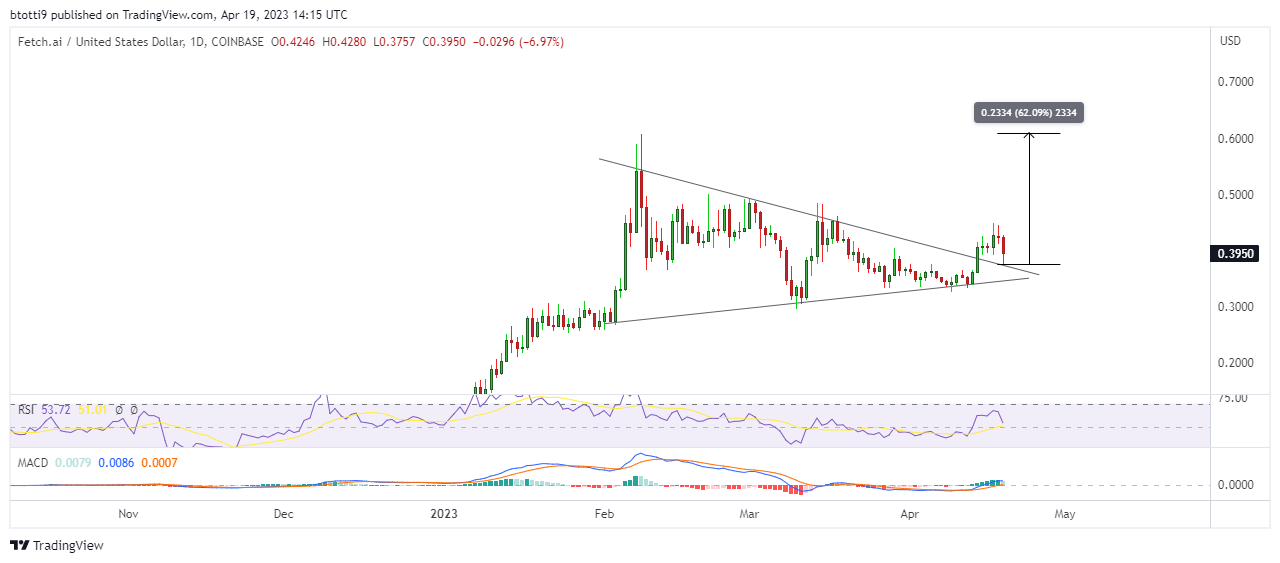 As can be seen in the Fetch.ai price chart below, FET/USD recently formed a bullish pennant – a technical indicator that usually suggests continuation on the upside.