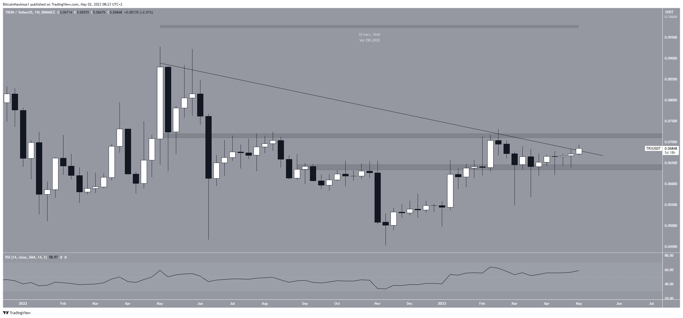 The TRX price has increased since November 2022. In February 2023, it reached a new yearly high of $0.073. However, the price has fallen since.