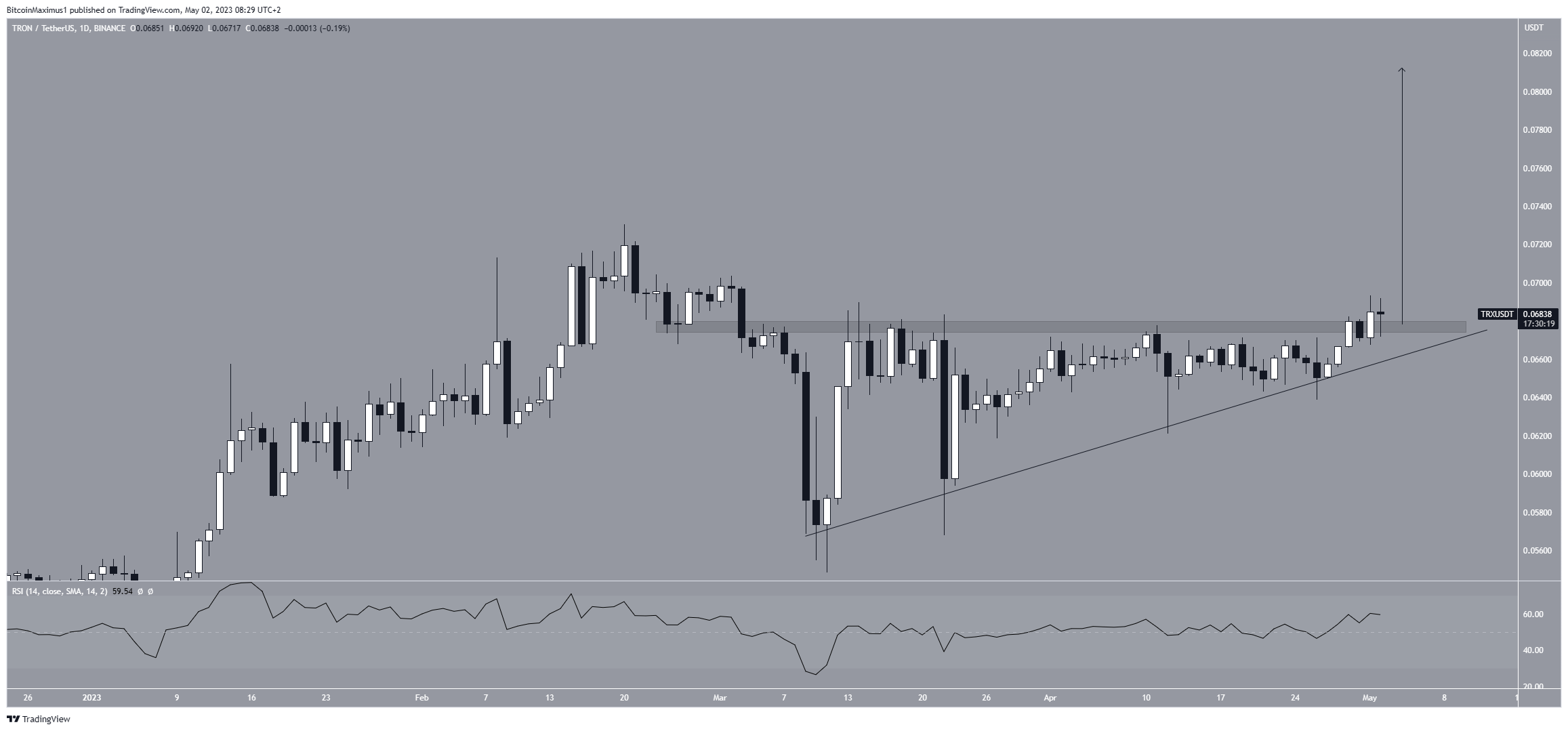 Firstly, the TRX price has moved above the $0.067 minor horizontal resistance area. When combined with the short-term ascending support line, this creates an ascending triangle.