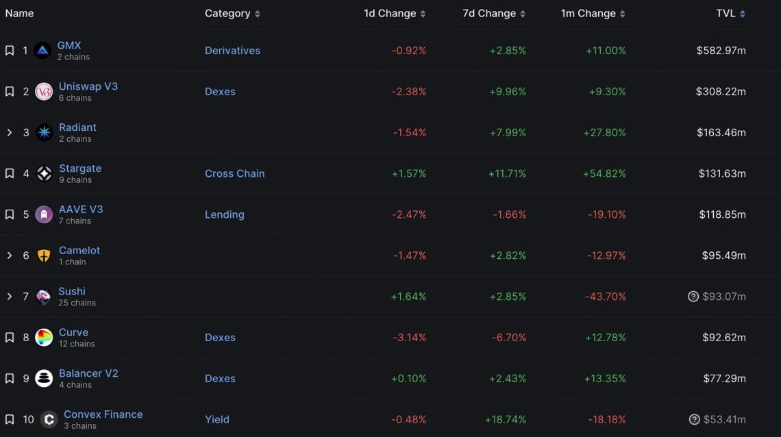 However, with Radiant, Stargate and Camelot DEX, Arbitrum based projects also occupy three more places within the top 6 decentralized exchanges, underlining the growth of the entire ecosystem. Furthermore, Arbitrum ranks 4th among all blockchains by TVL, just behind the layer-1’s Ethereum, Tron, and BSC.