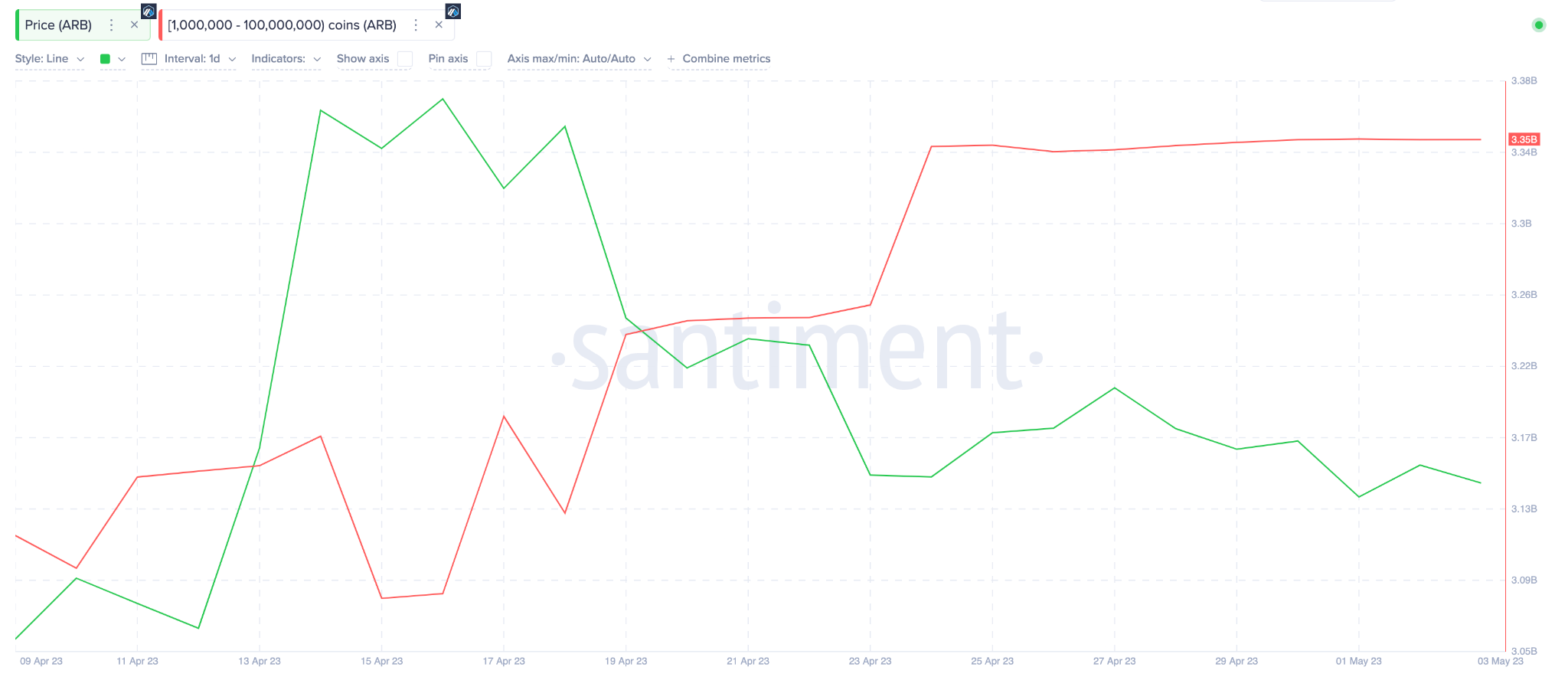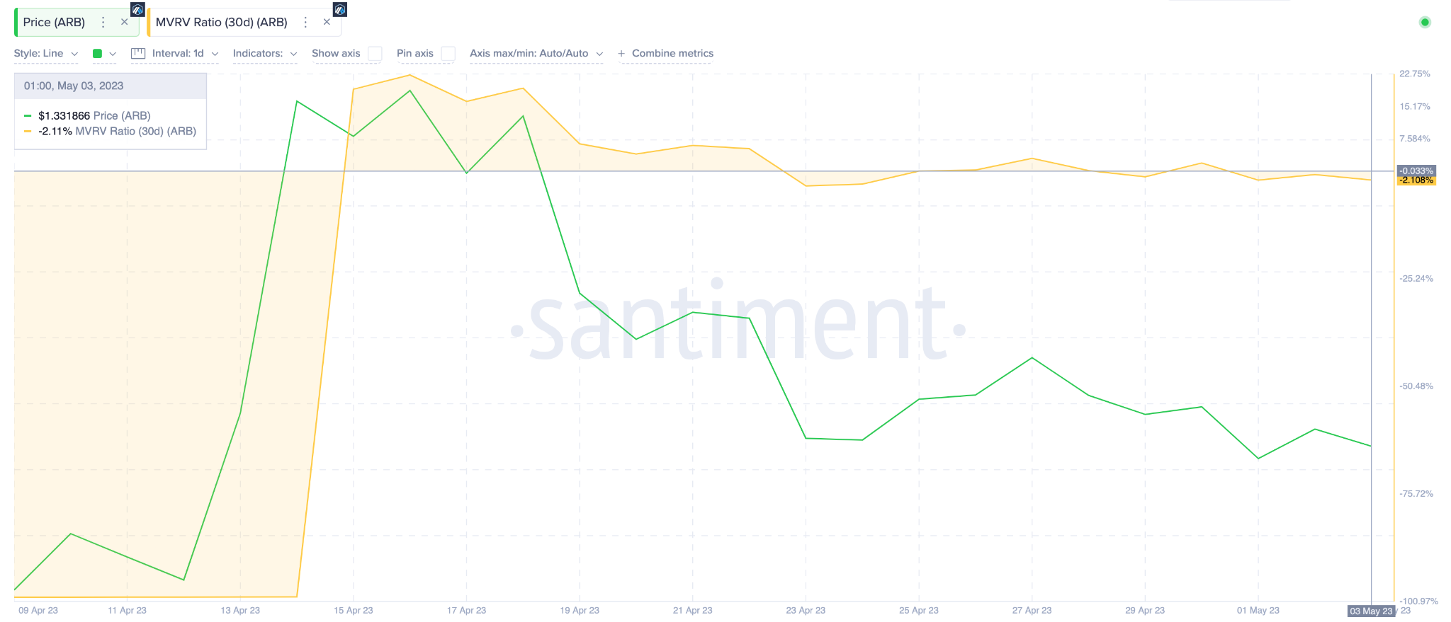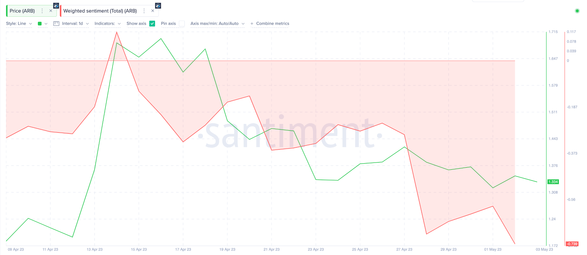 The chart below illustrates how the $ARB Weighted Sentiment has been trending negatively since the price dropped from the recent local high on April 14. Between April 14 and the close of May 2, it has dropped from 0.11 to -0.73.