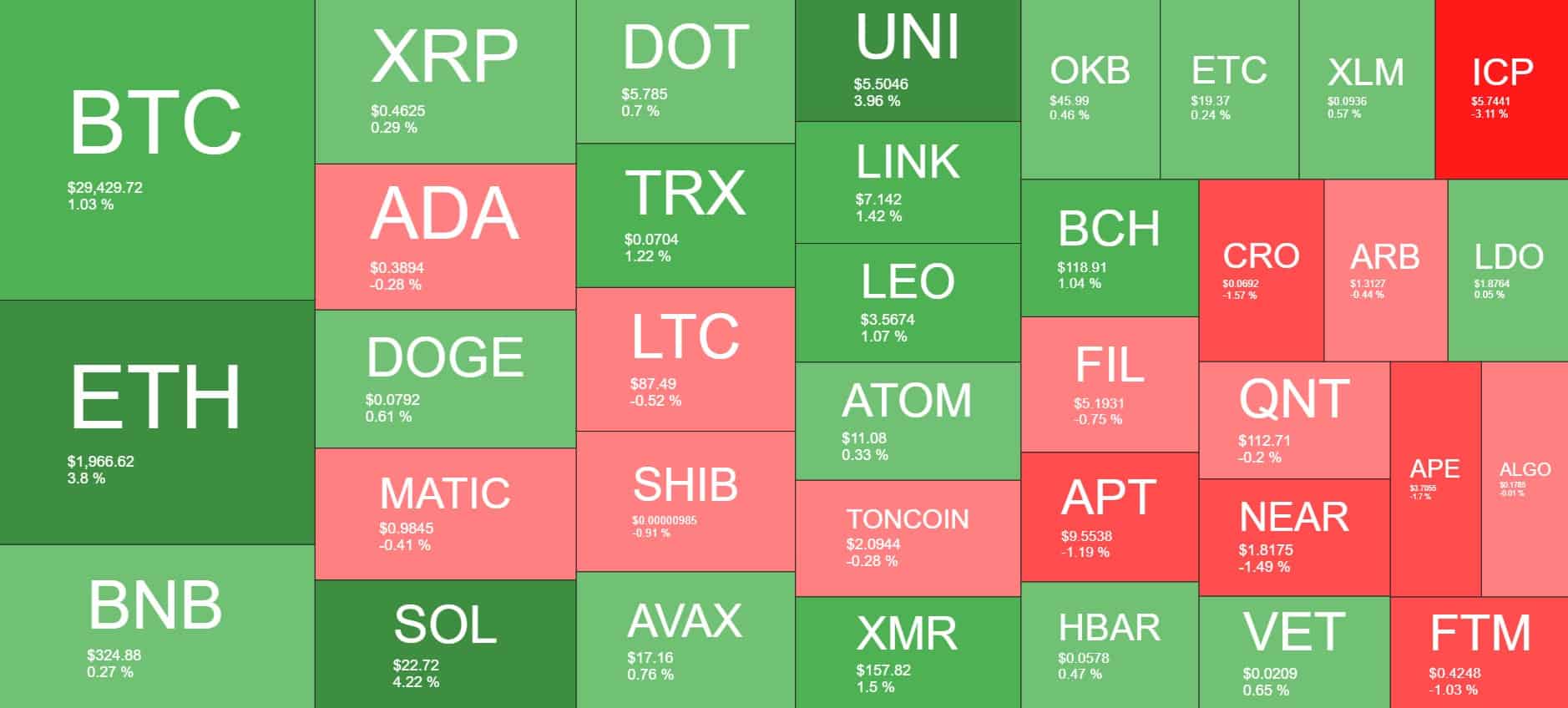 The altcoins are also on the rise, with ETH nearing $2,000, while SOL and UNI are up by 4% daily. However, the day belongs to PEPE and Floki Inu.