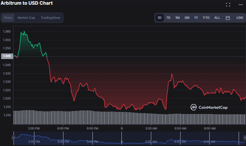 Arbitrum ($ARB) bullishness encountered early resistance at $1.36 and retraced to a 24-hour low of $1.31, where support was formed. As of press time, the bears’ influence was still visible in the 1.95% drop to $1.32.
