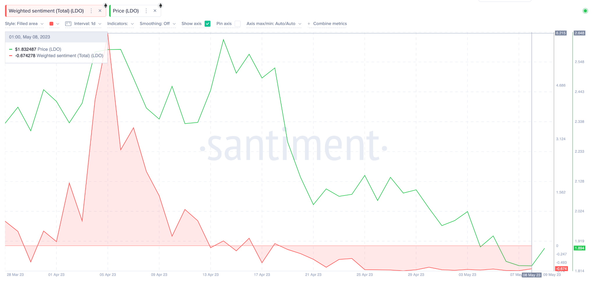 Moreso, the social perception surrounding $LDO has become largely negative in recent weeks. The Weighted Sentiment, which evaluates the ratio of positive mentions to negatives, shows that most $LDO stakeholders are pessimistic.