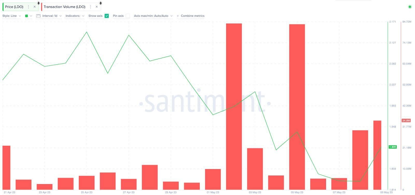 While the price has been in a downtrend since the start of May, $LDO has been recording a significant surge in daily Transaction volume. The chart below illustrates how total daily $LDO transactions have spiked above $30 million in four of the last nine trading days.