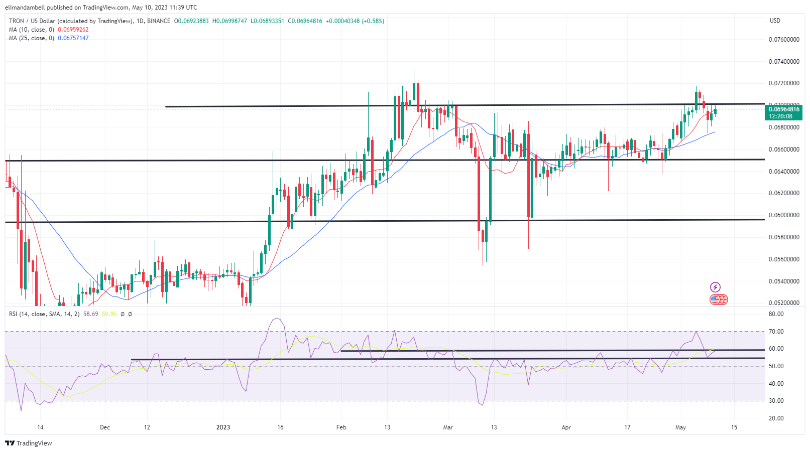 Following a low of $0.06841 on Tuesday, TRX/USD climbed to an intraday peak of $0.07031 earlier in the session.