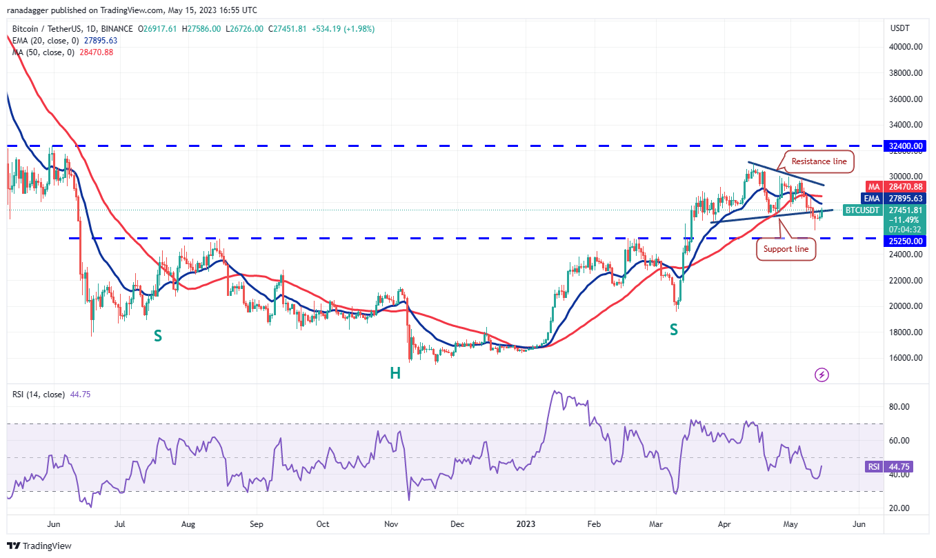 The relief rally is likely to face strong selling at the moving averages and again at the resistance line of the triangle. If the price turns down from the overhead resistance, the bears will make another attempt to sink the BTC/USDT pair to $25,250.