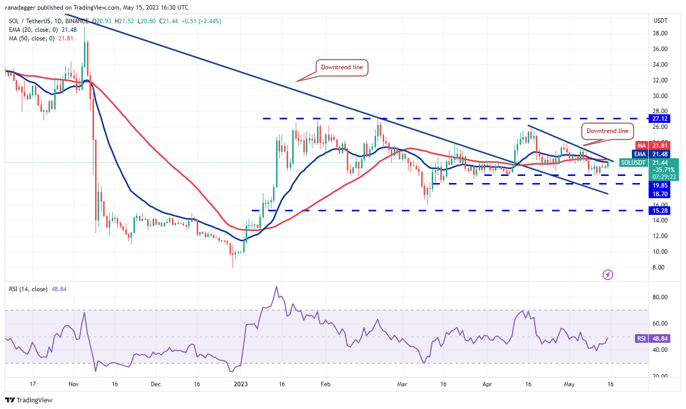 Solana’s (SOL) rebound off the strong support at $19.85 is nearing the downtrend line. This is likely to act as a strong hurdle for the bulls in the near term.