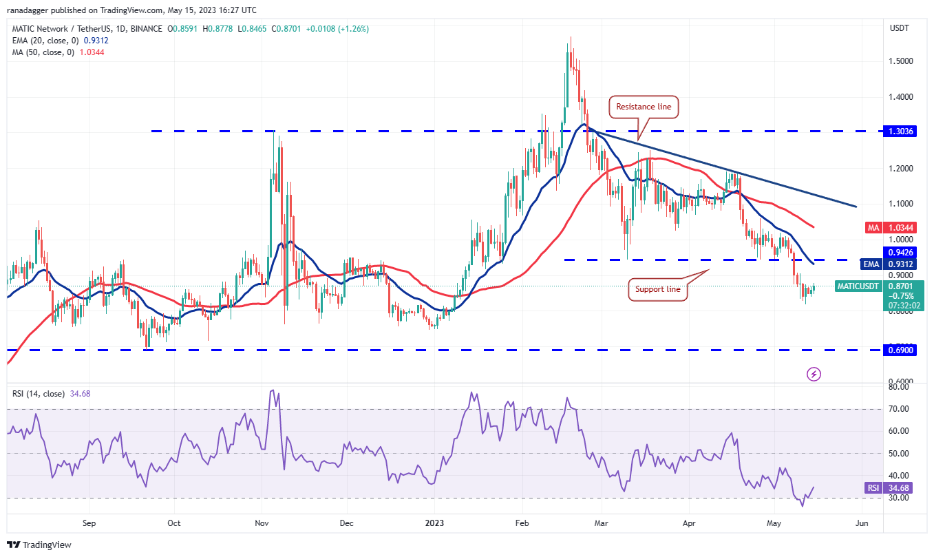 If the price turns down from $0.94, it will suggest that the bears have flipped this level into resistance. They will then try to strengthen their position further by pulling the MATIC/USDT pair below $0.81. If they succeed, it will open the doors for a potential decline to $0.69.